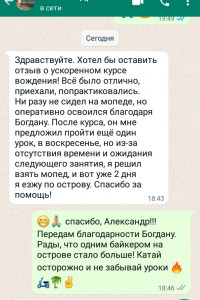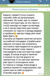 Кириллу-Мадлопт, Аригато, Коп кун Кап, Сей-Сей и далее по списку! Отлично все объясняет, если что-то у меня не получалось, то я сразу понимал почему! Доходчиво максимально!! Позитивно настроенный сенсей)) РЕКОМЕНДУЮ ОДНОЗНАЧНО!!!!! Я мопЭд вожу нормально, решил пересесть на взрослый мот! Без Кирилла не справился бы!! Еще раз спасибо! Успехов в начинаниях!!