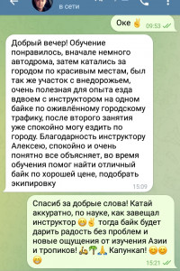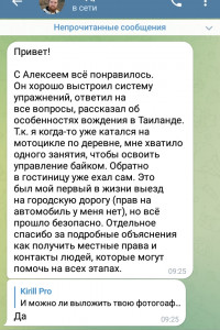 Увидеть остров без свободного передвижения невозможно, при этом хочется себя чувствовать уверенно на дороге, именно поэтому я выбрала поучиться водить байк в мотошколе Пиратская Бухта. Честно скажу, волновалась. боялась как и что. Но инструктор очень спокойно и доходчиво всё объясняет и показывает. Первое занятие на площадке, второе в горах — я думала сначала, умру от страха, но с таким инструктором всё очень спокойно и хорошо идёт. И третье занятие поездка вокруг острова, мало того, что тогда я очень боялась горок между Чавенгом и Ламаи, так ещё и дождь добавил экстрима, но всё оказалось очень успешно. И вот я на своём коне рассекаю уже 8 месяцев и чувствую себя очень уверенно. Спасибо вам и инструктору Кирилл за это!! За поддержку, качественное обучение и советы, они мне очень пригодились.