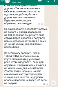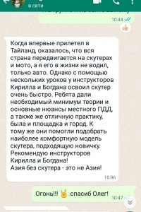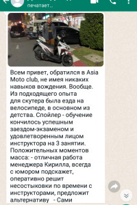 В Таиланде без байка, очень тяжко)) Последний раз я катался на чём либо лет 13 назад, но хорошо, что есть эти ребята. У них отличная продуманная программа, с кучей упражнений, которые мы отрабатывали долго и упорно, пока не стало получаться на лету. Помимо упражнений инструктор дал кучу советов, как по управлению в разных условиях байком, так и психологии вождении тайцев и туристов). За 2 недели после обучения, ни разу не упал с байка и даже не поцарапал). Нет смысла тратиться на таксистов, когда можно научиться кататься на байке и ехать куда хочешь). Спасибо большое Кириллу и всей мотошколе за их работу)