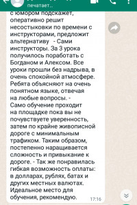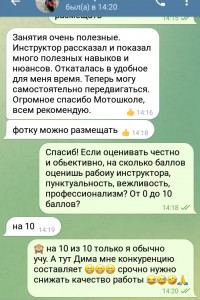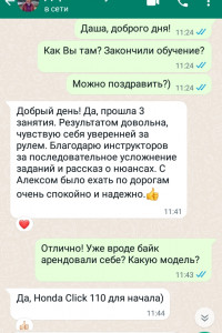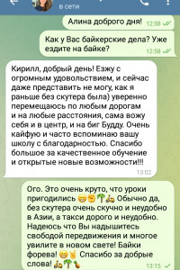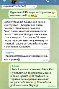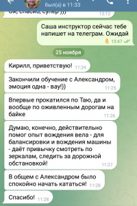 Хочу официально выразить свою признательность замечательному тренеру по обучению вождению мотобайка — Кириллу. Мотобайк я начала водить с «нуля» всего за несколько занятий. При чем, что у меня не было опыта вождения машины и я только-только освоила велосипед. Занятия проходили не только на площадке, но и в городе.В городе Кирилл смело доверял свою жизнь и здоровье сидя позади меня на мотобайке, пока я осваивала все повороты и горки. Хвалю за смелость